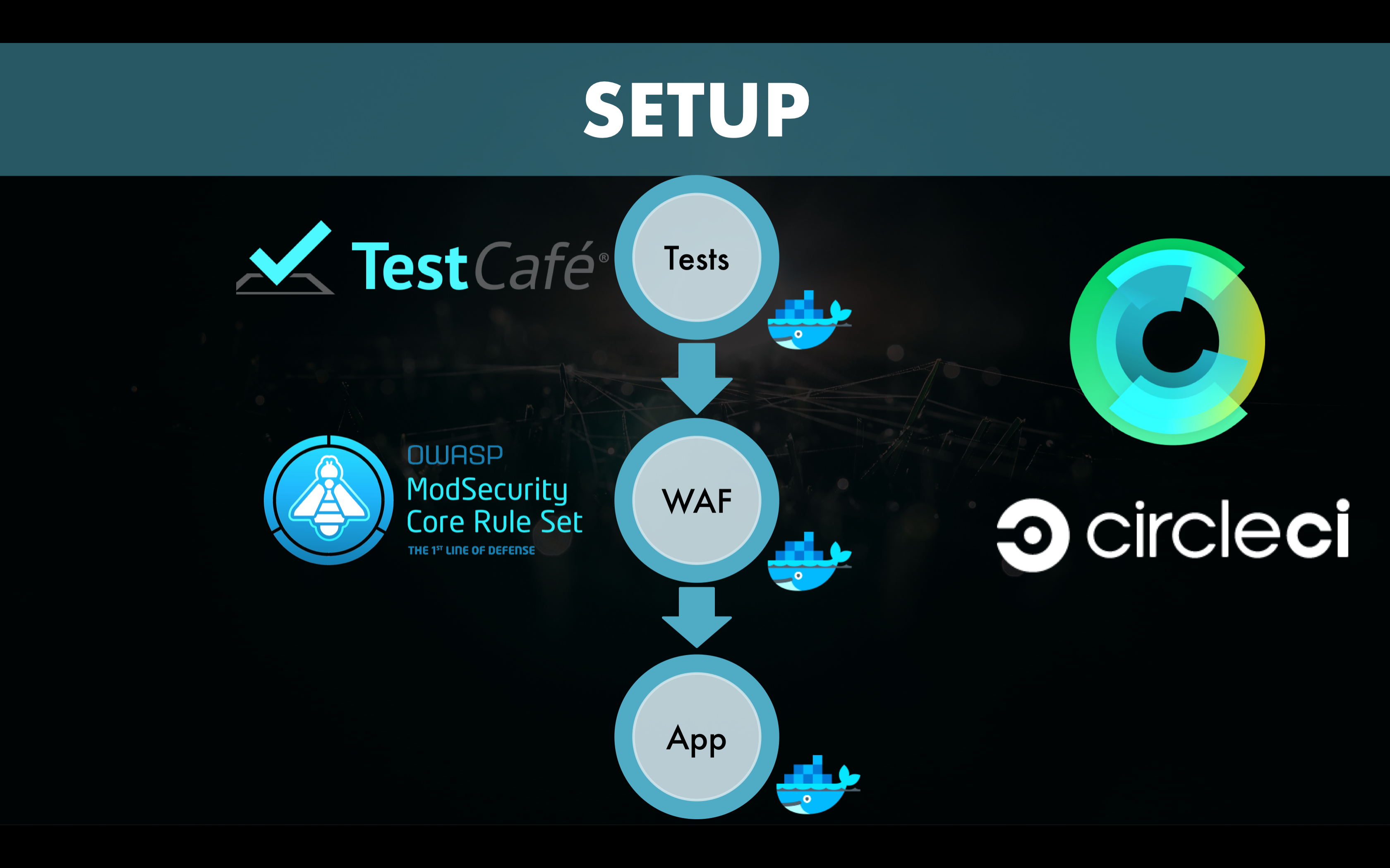 Here, we perform the application tests against the TCP port of the application container. We do this to be sure that the application and the application tests are working. We want to distinguish failed application tests caused by the application itself from false positives introduced by CRS.